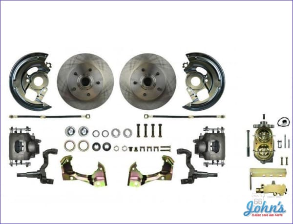 Front Disc Brake Conversion kit, NON-Power, with Standard Rotors. This Kit Includes: rotors, dust caps, grease seals, inner & outer bearings, cotter pins, loaded calipers & caliper brackets, spindle gaskets, backing plates, steering arm bolts, combination valve & bracket and hardware, master cylinder, pedal rod extension, flex hoses with clips, spindles, castle nuts, and banjo bolts.